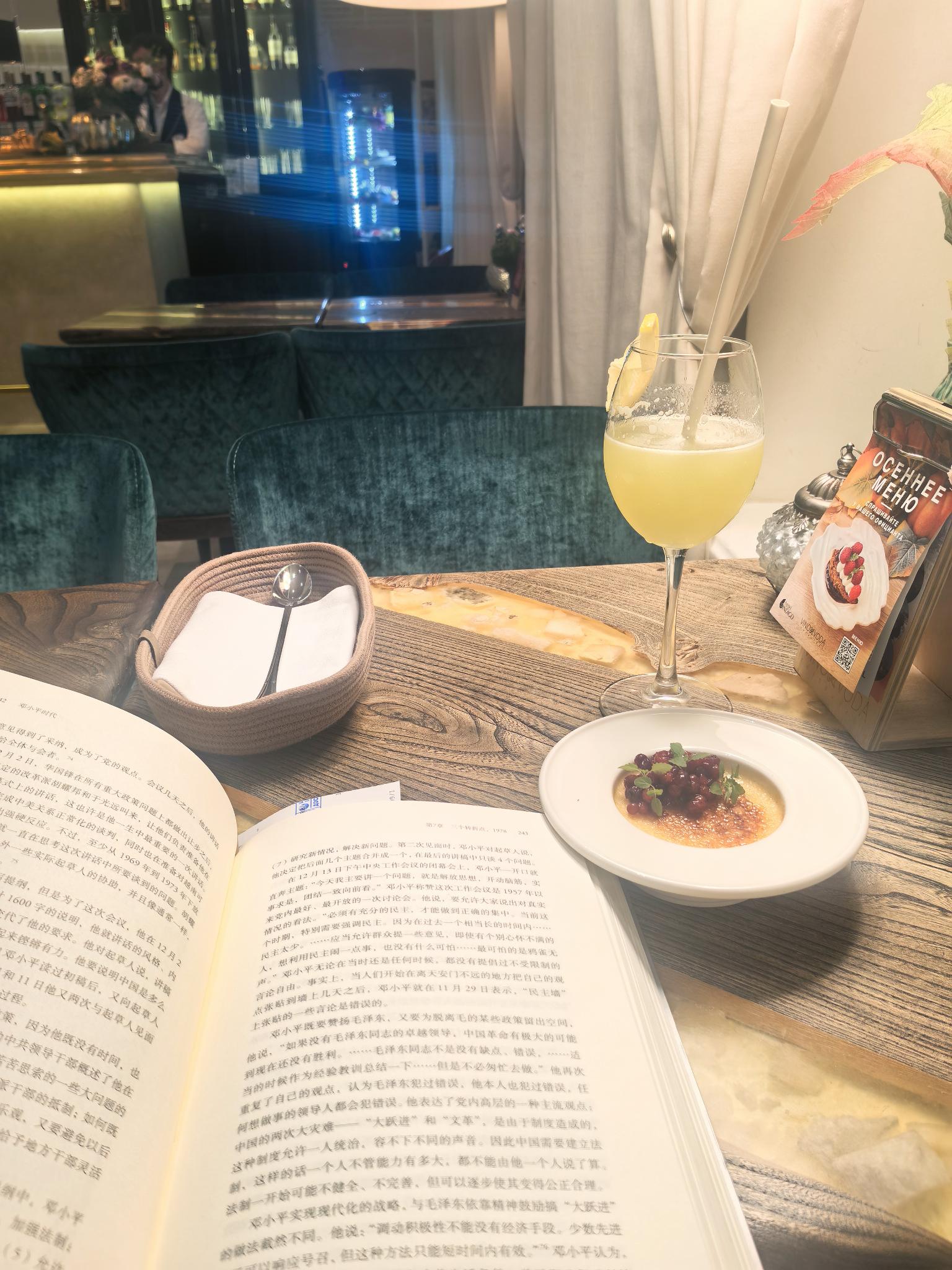 我觉得自己已经没有以前那么热爱出差,但我依然热烈的喜欢晚上独处小酌和看书的时间,甚至有些傲娇。我猜用不了十年,两三年后如果读到现在的文字,都会觉得可笑,不过当下确实欢喜—娃娃们和妈妈去埃及度假了,自己找了个小酒吧,一张小桌子,两杯酒,一个焦糖布丁,外加打发时间利器—一本书。我在这儿待了快两小时了好像,并不会有只喝酒带来的无聊。